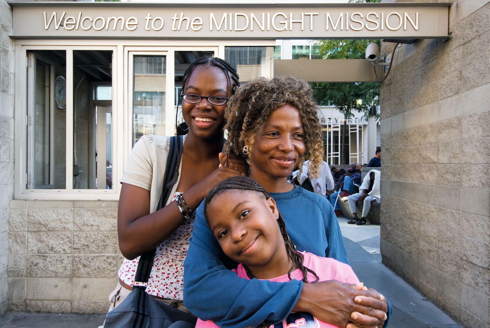 Janine, her older sister and their mum will soon join the long queue for the Midnight Mission shelter. It’s in the heart of the homeless neighbourhood and hundreds of people are hoping to get some food and a bed here tonight. This is called "safe sleep" because it can be really dangerous on the streets in this part of town at night.