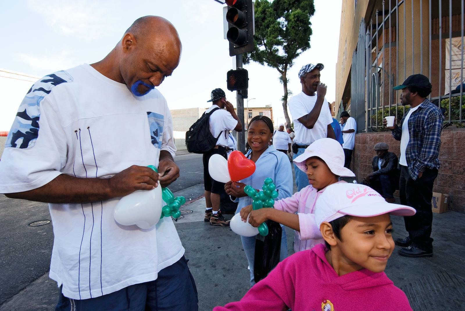 Halfway there, they meet the balloon man, Joe, who is an expert at making balloon figures. He makes balloon flowers and rabbits for some other children who are there with a staff member from School on Wheels. “Please, please, could you make me a heart?” asks Janine.
