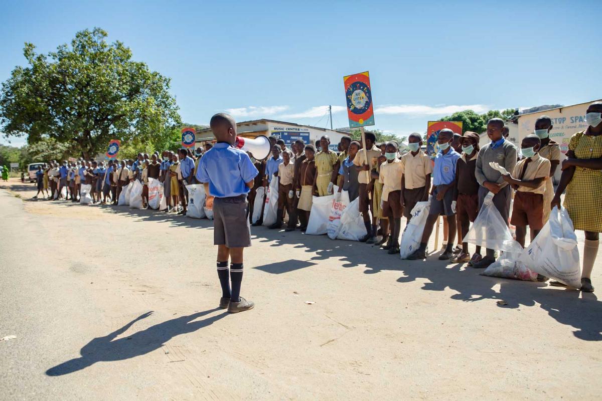 School children in Zimbabwe cleaning up their neighbourhoods on their own No Litter Day, at the same time sharing information about children's rights and caring for the earth.