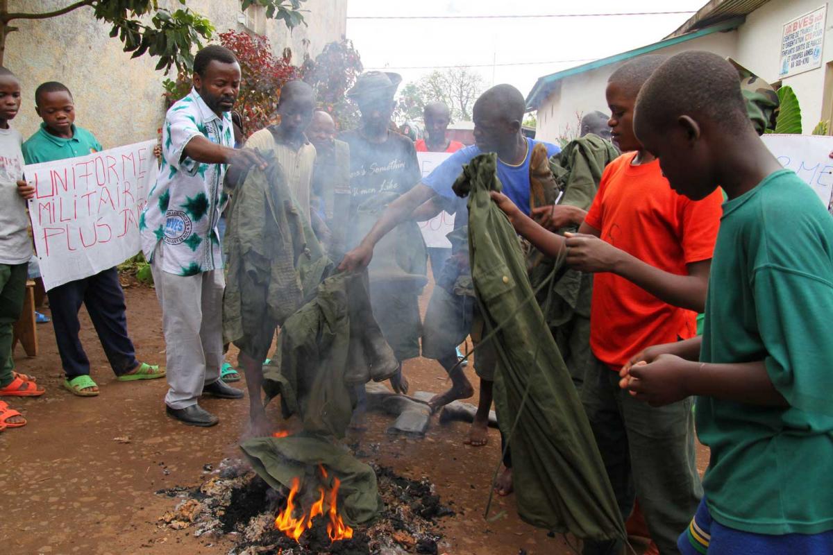 Former child soldiers on D.R. Congo burn their military uniforms before returning to school.