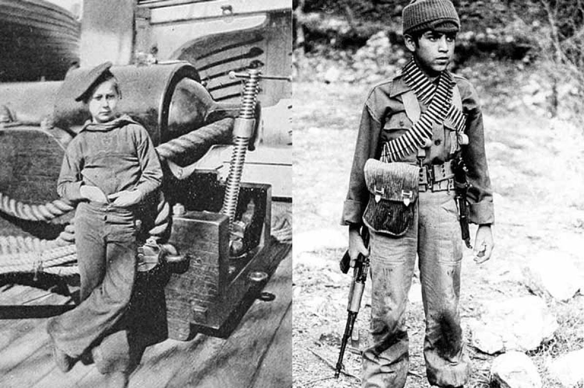 Children used as soldiers from two different wars: On the left, a boy on a US war ship in 1911, on right a boy fighting in the Iraq-Iran war in circa 1980s.