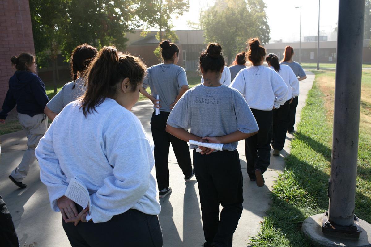 Girls from violent gangs walk to school inside a Juvenile detention center in Sylmar, California, USA.