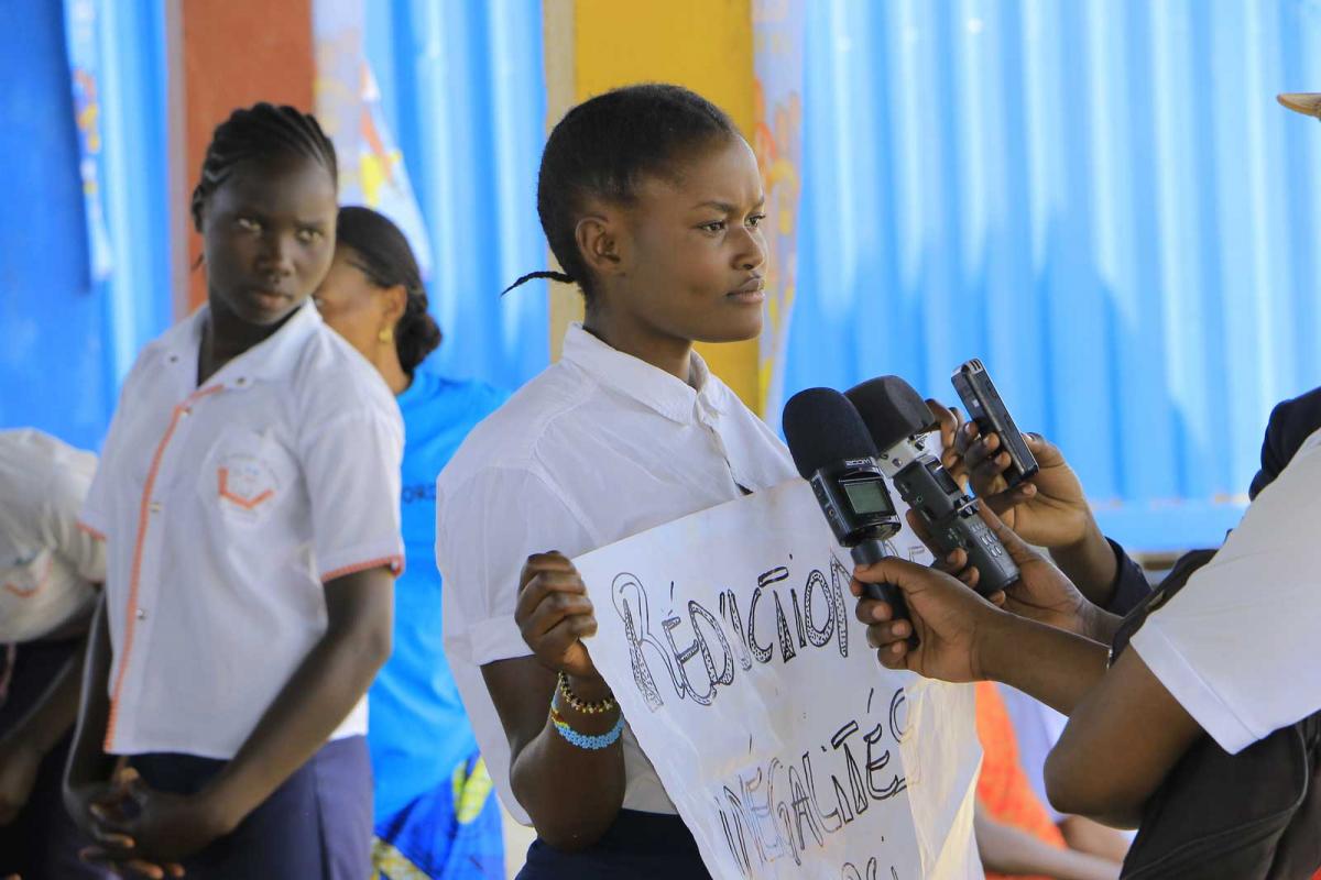 A girl in the Democratic Republic of Congo is interviewed by local reporters about the challenges girls in her village face.