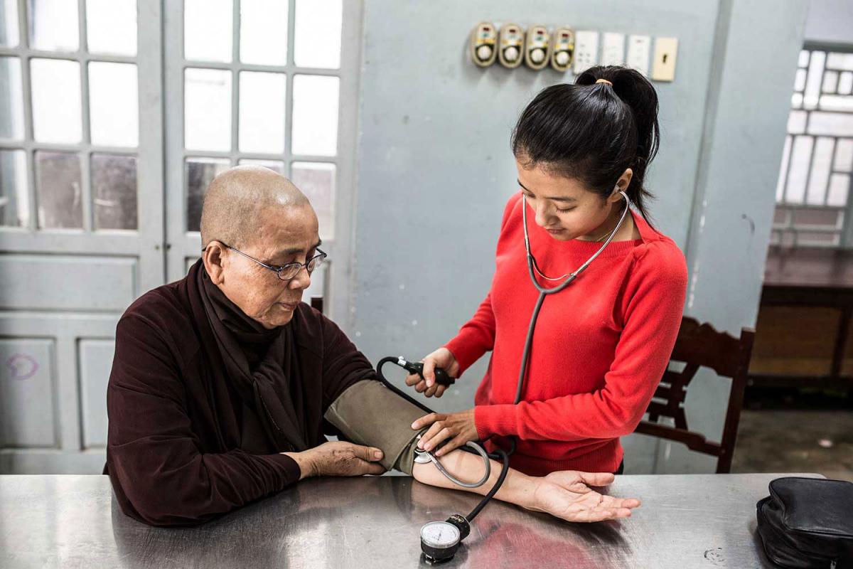 After high school, Thao was accepted into nursing school. She now works at the hospital in Huế, but every weekend she travels to the pagoda. While she’s there, she carries out health checks on both the children and the nuns.