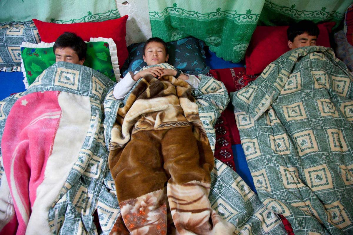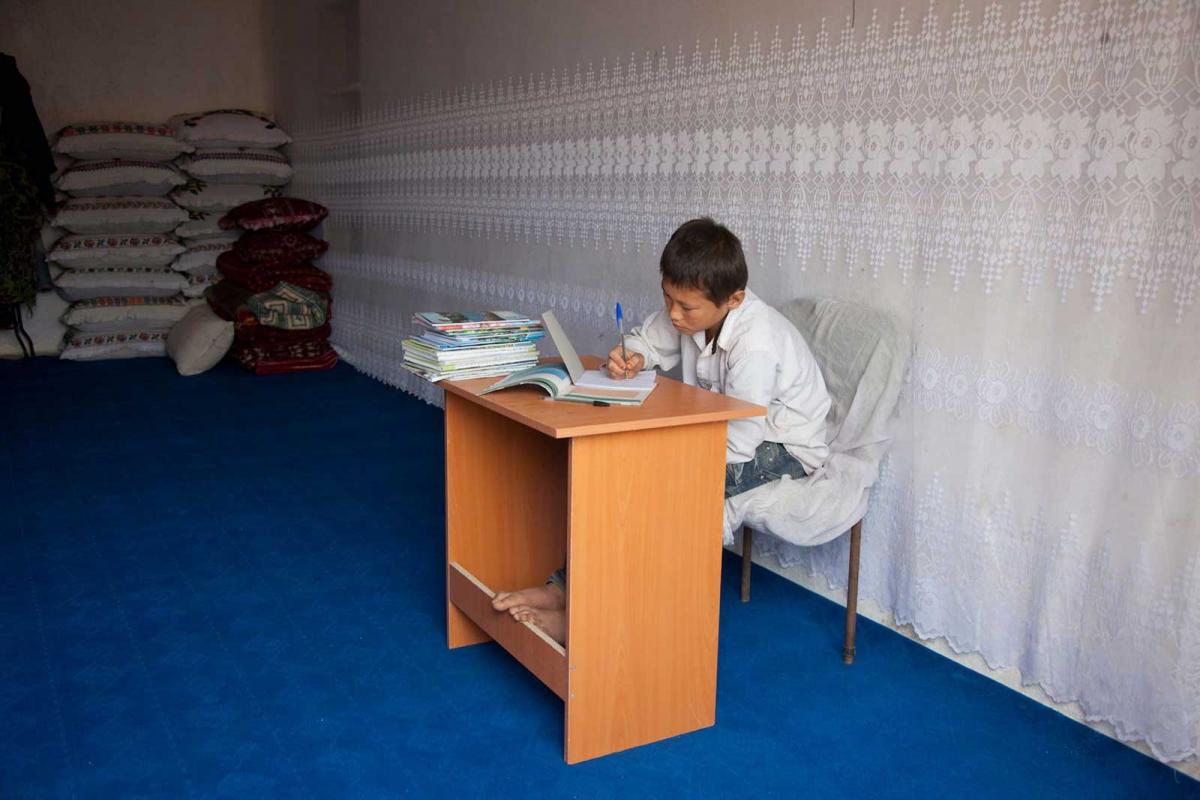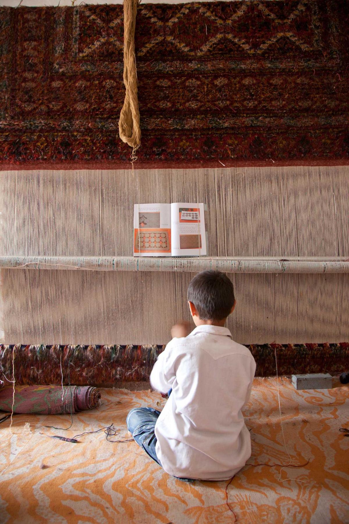 1.30 p.m. Muhammed and his brother take it in turns to sit at the rug-loom. “I’m so used to making rugs that I usually put a book on the chair and read my homework while I’m doing it,” explains Muhammed.