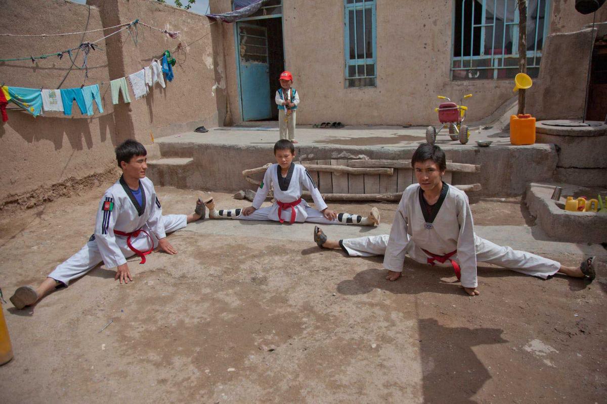 4.30 p.m. Today there is no taekwondo practice, because the coach is away. Muhammed and his brothers practice their high kicks and splits in the garden instead. They do push-ups, stretches, and some sparring.