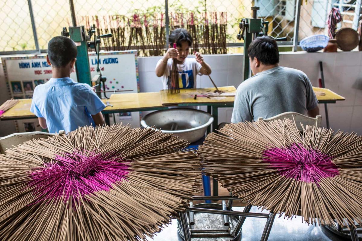 “Can you pass me more sticks, Nhi,” he asks a younger girl who is helping him. On a good day, Nhon can make a thousand incense sticks. On those days he has help from Nhi’s big brother.