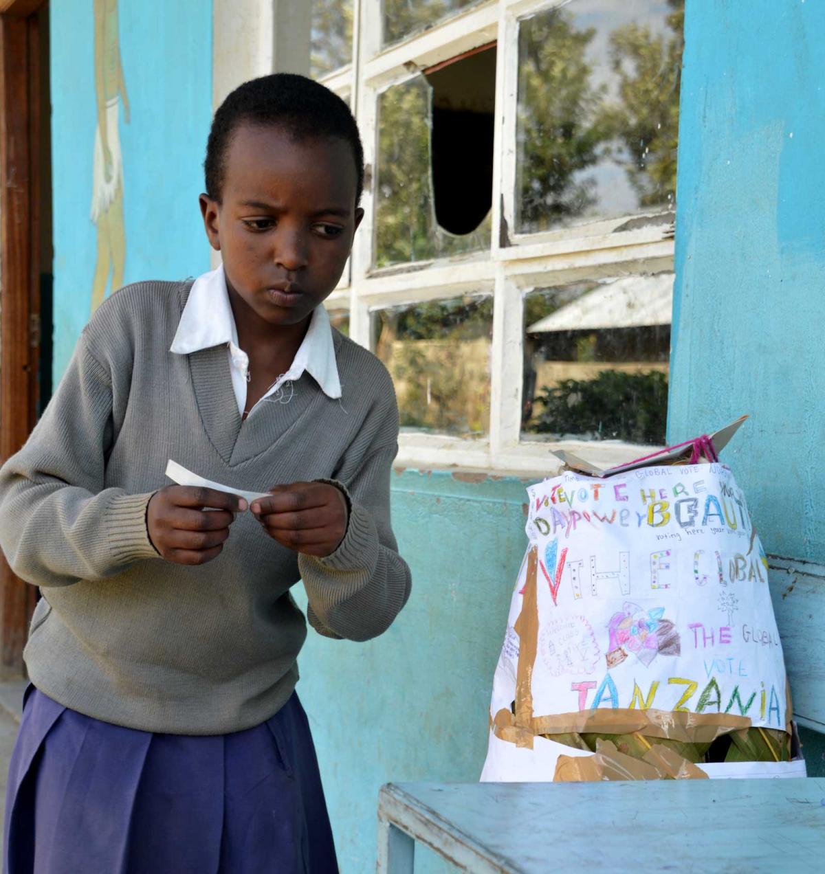 A girl casts her vote in the WCP Global Vote in Tanzania. ©WCPF