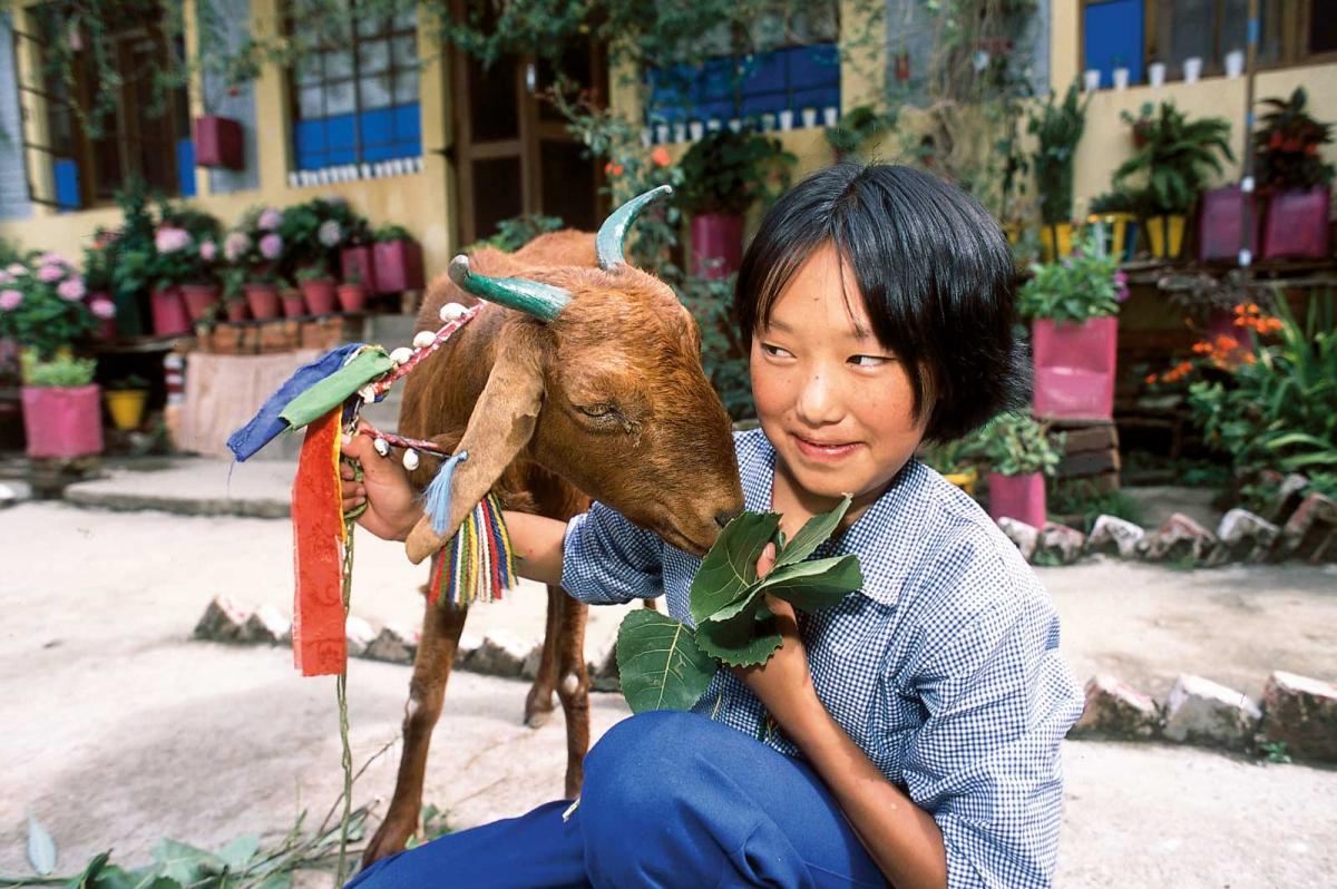 The children in Tashi's house take care of a goat that they saved from slaughter. © Kim Naylor/WCPF