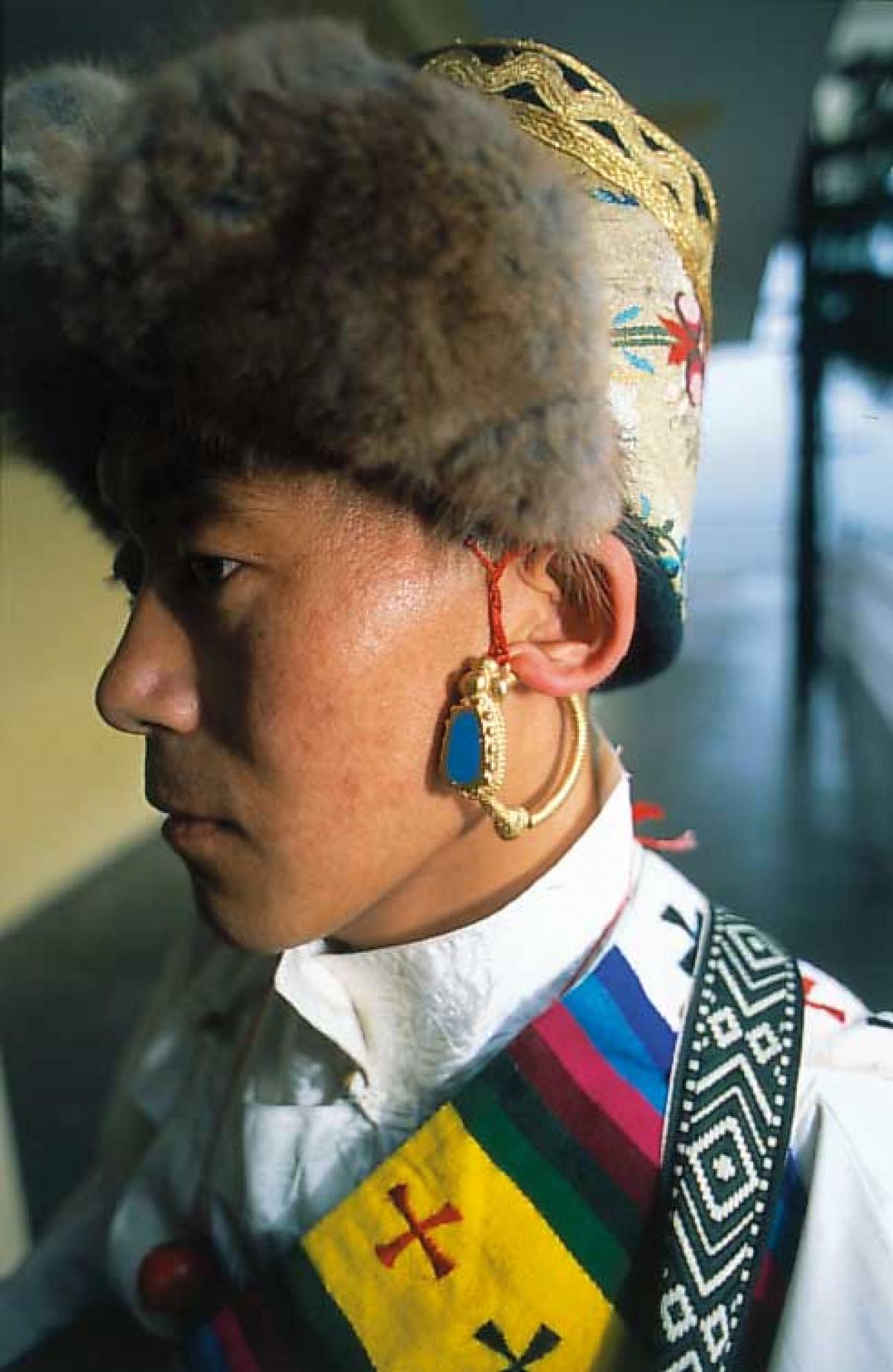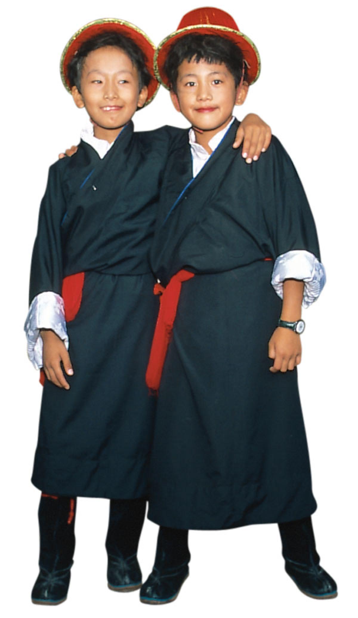 Both girls and boys in Tibet wear a chupa, an ankle-length coat or dress that is held together with a belt. Usually it is made from simple material and is one colour. For a party is can be made of silk with beautiful patterns. The man’s chupa has long sleeves and is made of thicker material than the woman’s sleeveless dress variety.